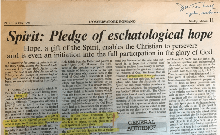 Well today, I actually reread it. It was an article by Pope John Paul II on the Holy Spirit published on July 8, 1991 (page 11) in L’Osservatore Romano – the Vatican newspaper. It was very good !!!