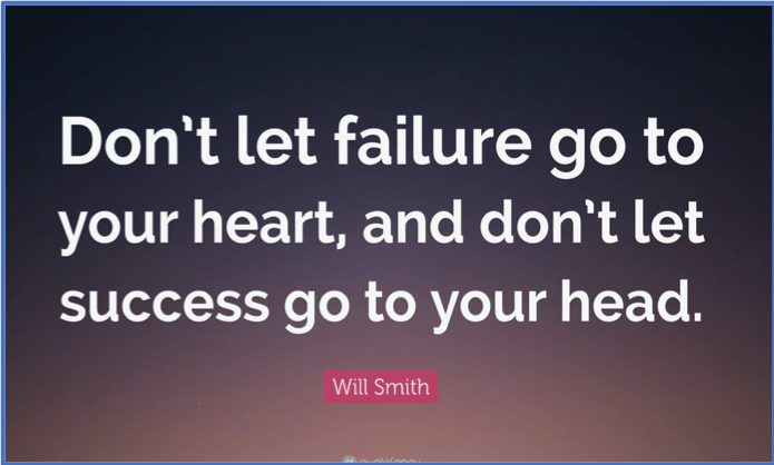 Sounds simple, but it’s not always easy. So let’s recall the words of Will Smith, “Don’t let failure go to your heart, and don’t let success go to your head”. Or better yet, remember that “pride goes before a fall, but humility before honor.” (Prov. 16:18)