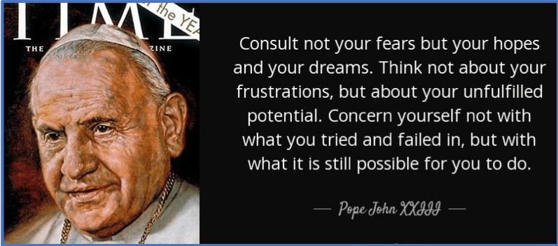 Pope John lived from  1881 to 1963, one of the most tumultuous periods in history. Ordained in 1904… he experienced WWI & WWII, the Holocaust, Communism, the Bomb …… . He was a great diplomat as well as a saint. He was respected all over the world… France, Bulgaria, Russia, the U.S., Israel and the Middle East. In all of his high level interactions, he would say, “whoever has a heart full of love always has something to give.” The quotes listed in his picture can speak to our current difficult times….”consult not your fears but your hopes and your dreams….”